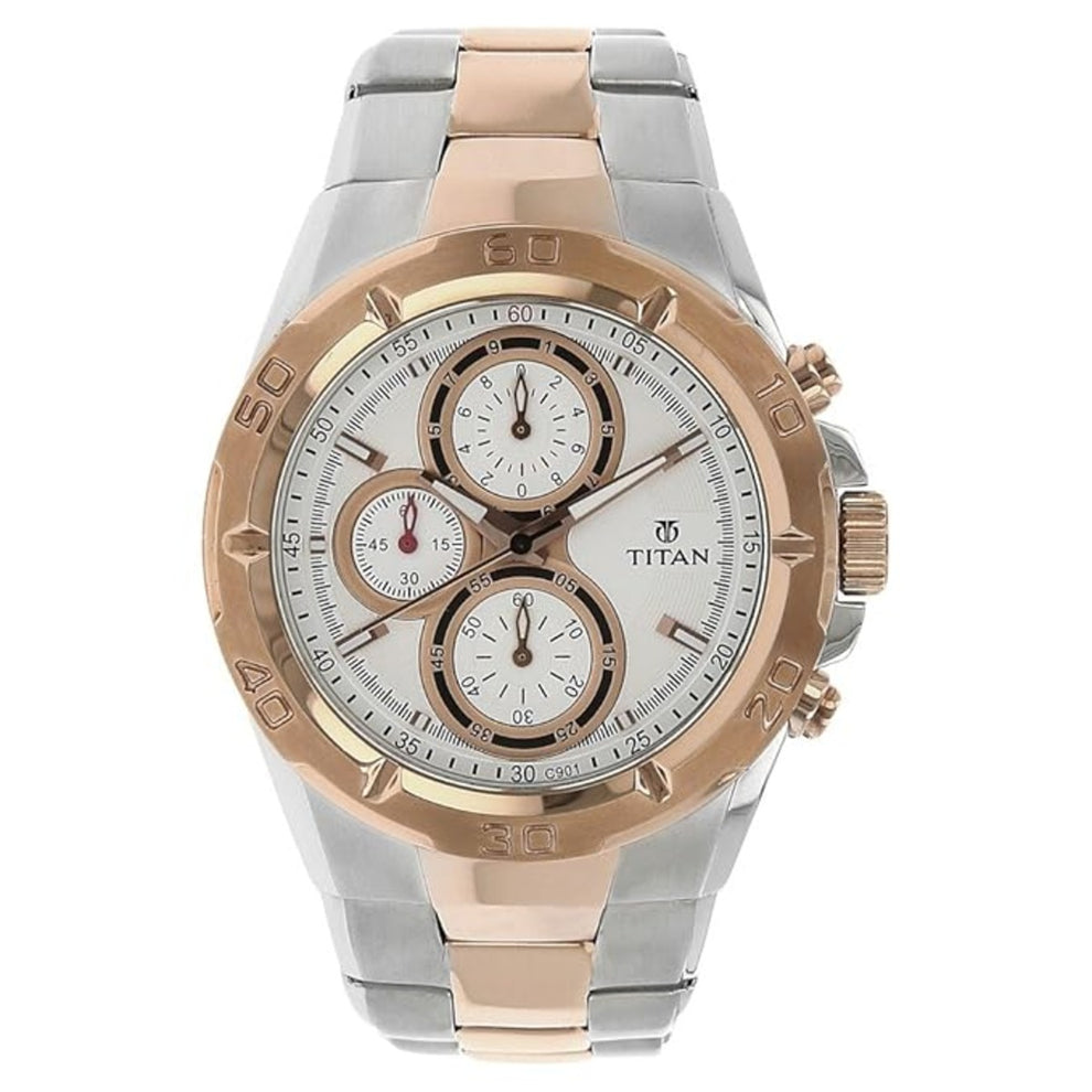 Luxury doesn’t need to be loud — and the Titan Chronograph White Dial with Stainless Steel Strap proves that. With its crisp white dial, gold accents, and steel bracelet, this watch offers a refined dual-tone appearance that complements formal or business attire effortlessly.